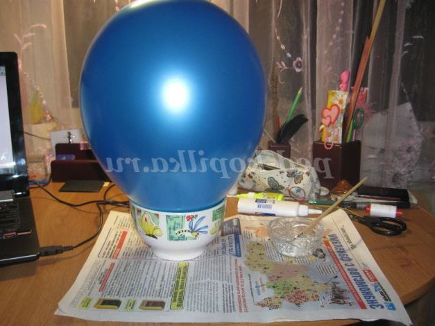 2. Перевертаємо кульку і ставимо його в тарілку. Наливаємо клей в посуд, в якій буде зручно працювати пензликом.