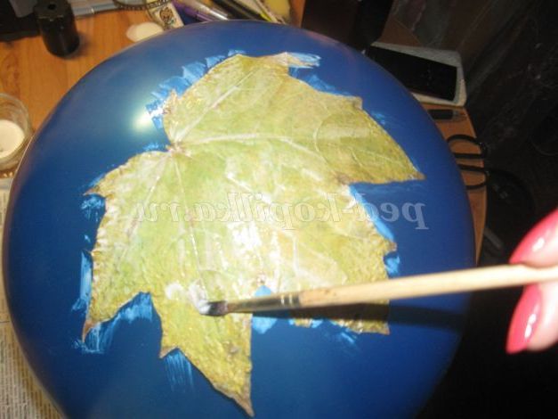 6. Наносимо на кульку клей і приклеюємо листочки по колу, не забуваючи покривати листя клеєм зверху.
