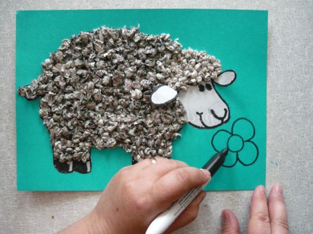 Намазуємо ніжки овечки клеєм ПВА, приклеюємо газетні кульки маленького розміру і зафарбовуємо чорним маркером копита овечки.