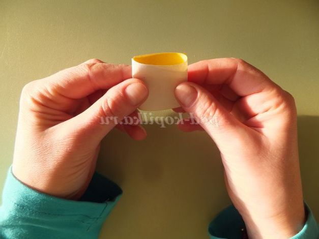 4.Складываем рожевий прямокутник на 3 частини, вирізаємо коло-серцевину і наклеюємо їх в центр жовтих квіточок.