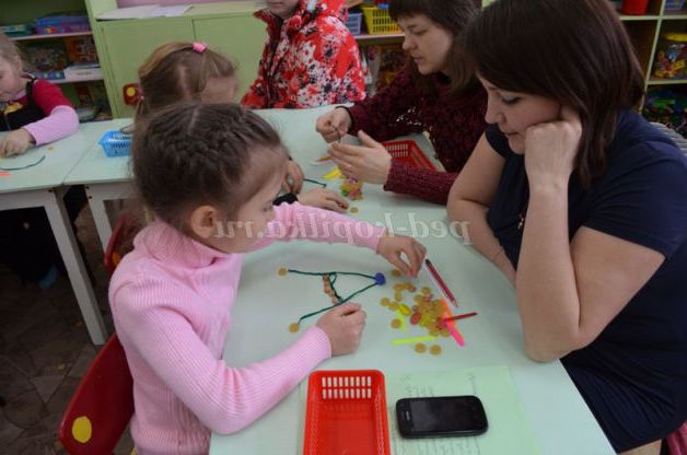 Обладнання: магнітна дошка, по одній кошику на кожному столі. Вміст кошиків: картинка, насичена зоровими образами букв; друкована картка з літерами; лічильні палички; трубочки; макарони-квіточки; намистинки; ґудзики; нитки.