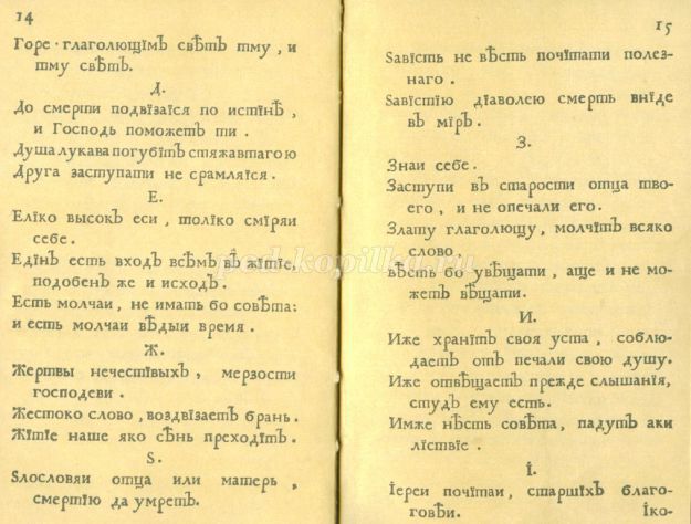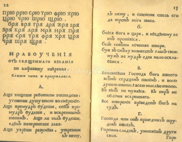 У першій її частині поміщені азбука, таблиці складів, цифр і релігійні заповіді. Ця азбука є одним із перших посібників з навчання новим цивільним (світської) шрифту і арабського написання цифр замість церковнослов'янської. Малюнки «рис.3.jpg», «рис.4.jpg», «рис.5.jpg», «рис.6.jpg», «рис.7.jpg»).