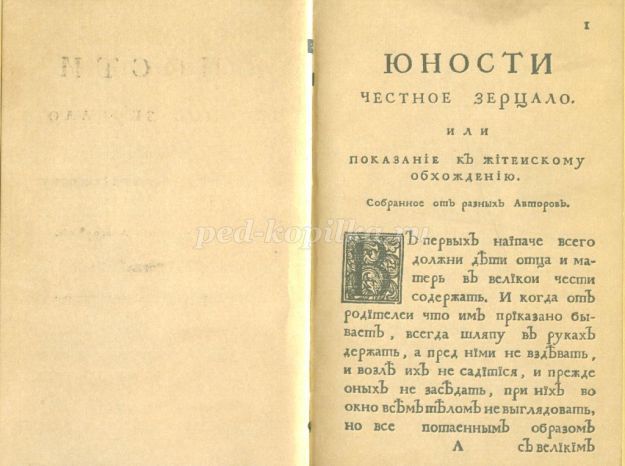 У 1717 р. за розпорядженням імператора Петра I була видана книга «Юності чесне зерцало, або Показання до життєвого обходження» (малюнок «рис.2.jpg»), тобто майже 300 років.