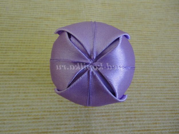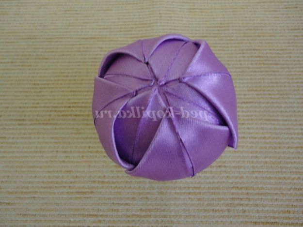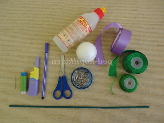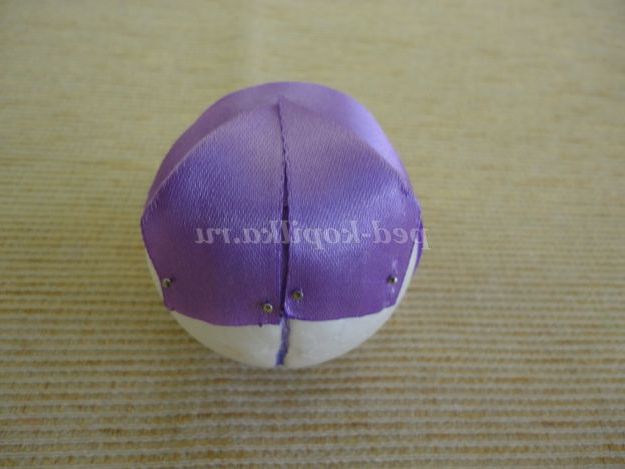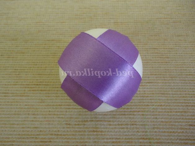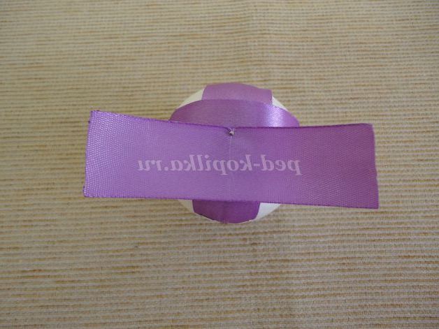 Знаходимо центр кулі, беремо відрізок стрічки 2,5 на 8 см (попередньо зігнутися навпіл) і встромляємо декоративну шпильку в край відрізка стрічки