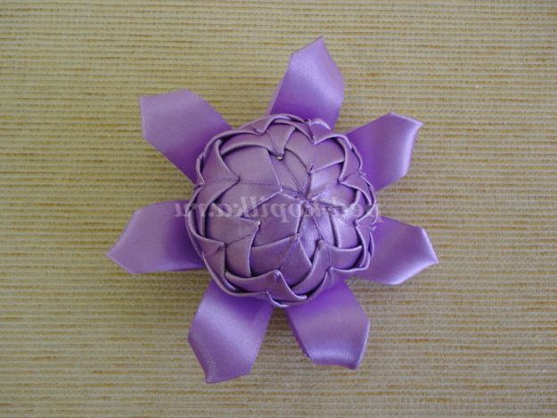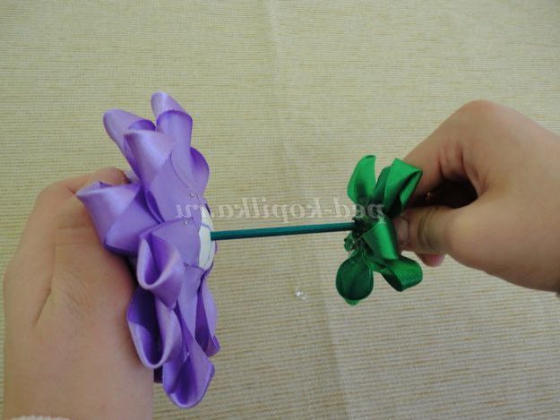 Щоб виконати довгі, звисаючі пелюстки, необхідно взяти фіолетові стрічки відрізком 2,5 на 10 см і перегнути їх під прямим кутом, а потім з'єднати зрізи, закріпивши тимчасово декоративної шпилькою. Всього необхідно зробити 21 пелюстка.