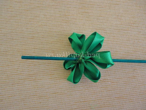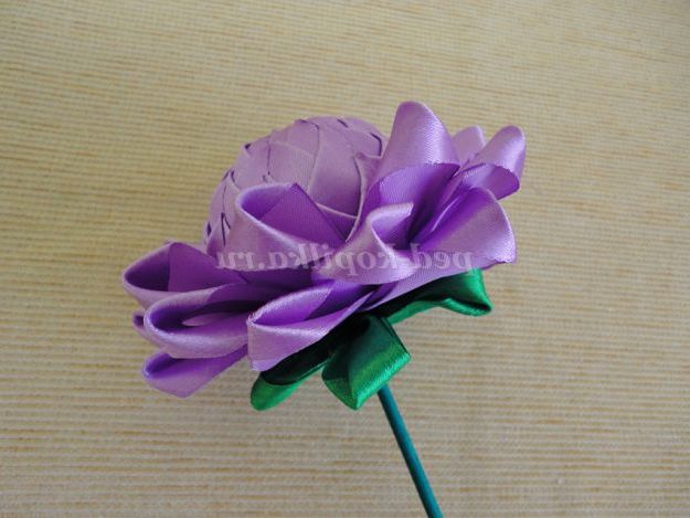 Залишилося пов'язати зелену капронову стрічку 1 м 20 см на стебло, склавши вдвічі і зав'язавши бантом. Це у нашого фантазійного квітки з'явилася листя!
