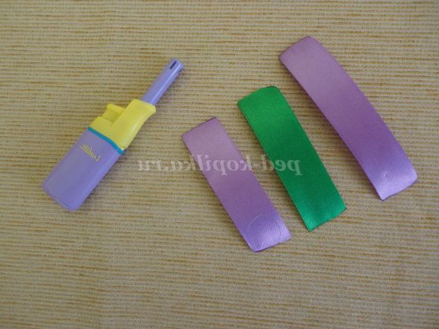 Обпаліть за допомогою запальнички всі нарізані на відрізки стрічки, це необхідно зробити, так як краю у атласних стрічок швидко обсипаються (довіряти дану операцію дітям не можна)!