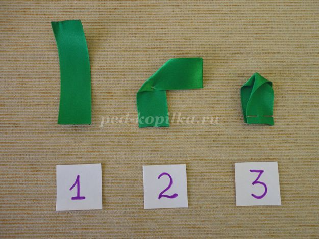 Вивчивши схему, ми зрозуміли, що необхідно прямокутний відрізок стрічки перетворити в трикутник, закріпивши його на пінопластової основі 5-ма декоративними шпильками (цвяшками).