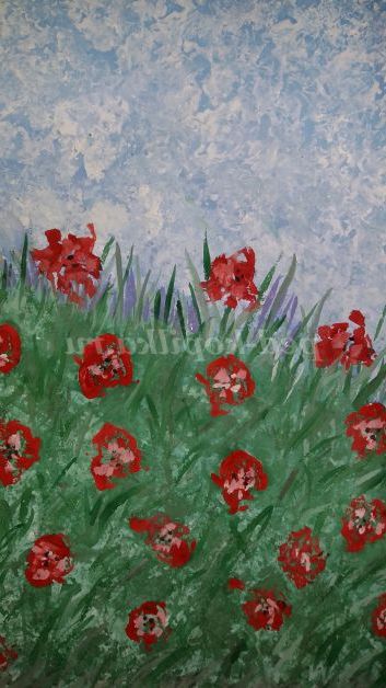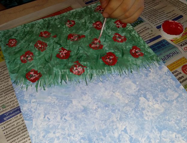 4.Обмакиваем грудочки в червону фарбу і залишаємо сліди на папері у вигляді маків.