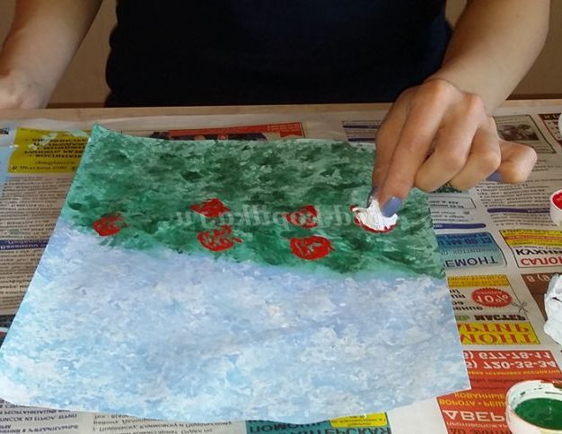 3.Обмакиваем грудочки в тарілки з фарбою і притискаємо грудочки до аркуша паперу, залишаючи відбитки у вигляді хмар і трави. Можна заздалегідь намалювати контури бажаного зображення, а потім його запечатати.