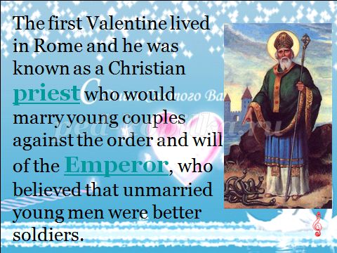 Вважається, що святий Валентин - це єпископ Тернійскій. Він як священик вінчав молоді пари всупереч наказам Клавдія другого, який у кожному самотньому неженатом чоловікові бачив тільки свого солдата. За це єпископ і був спалений на багатті за однією версією 14 лютого 270 р. в Римі, з іншого - у 360 р. в Терни.