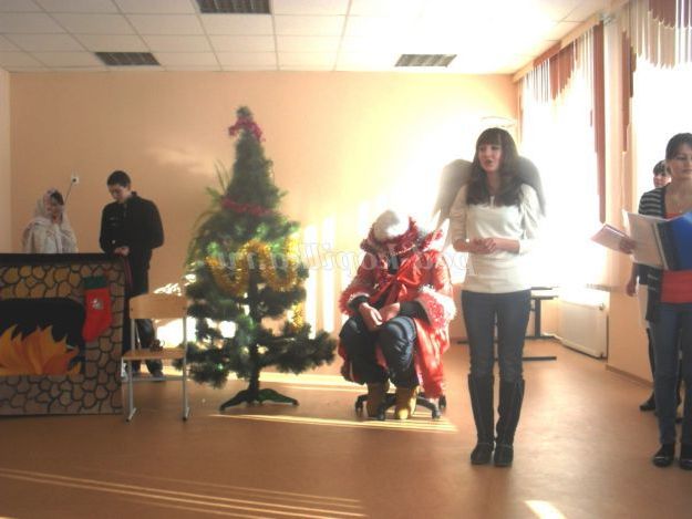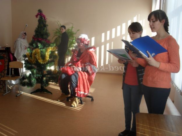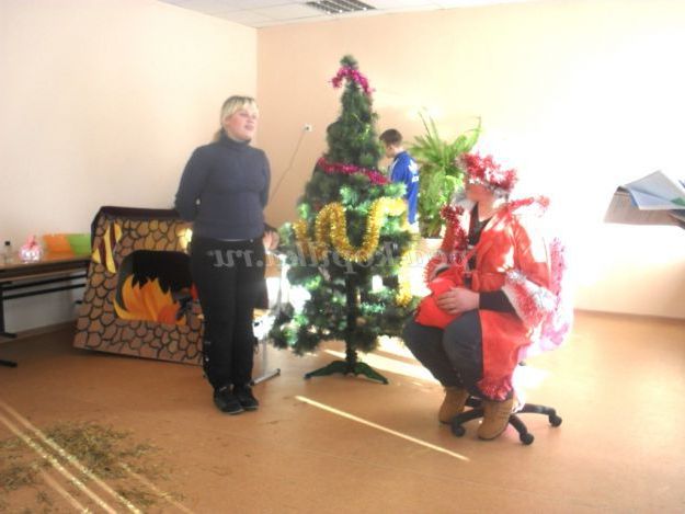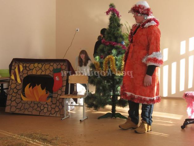 Матеріали та обладнання: намальований камін, дитячі панчішки, гостинці для дітей, свічки, велике крісло, обтягнуте червоною тканиною, прикрашена новорічна ялинка, канделябр зі свічками, безліч коробок різного розміру (це - подарунки).