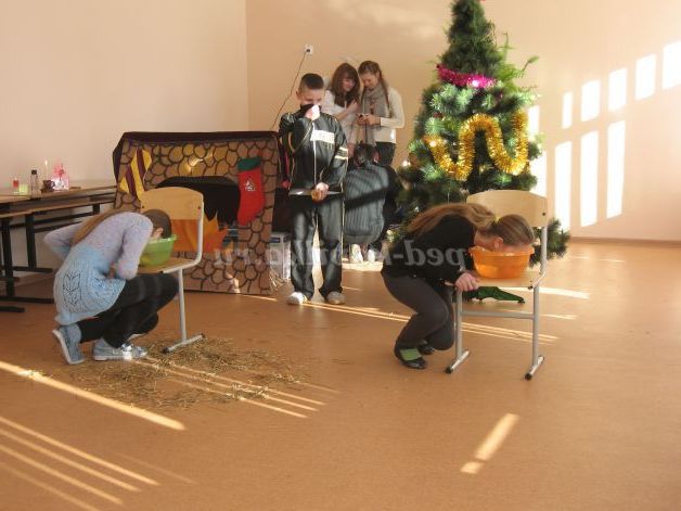 Тепер для вас як і годиться на святі - традиційні різдвяні ігри. Те, без чого на Різдво не можна обійтися. На сцену виходять по три людини від класу.