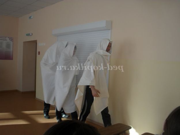 В цей самий момент на сцені і справді з'являється привид в білому костюмі, який складається з накидки і загостреного ковпака. На ньому чорною гуашшю намальована страшна пика. Привид проходить по сцені і направляється до ведучого.