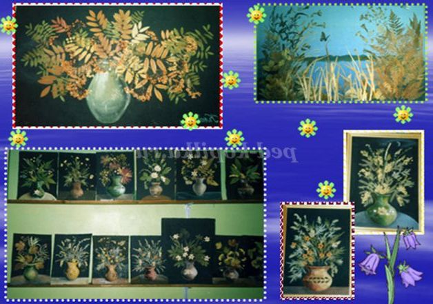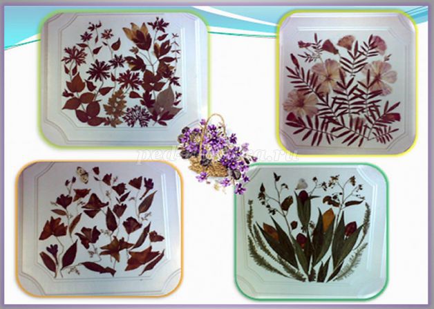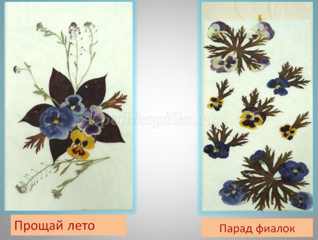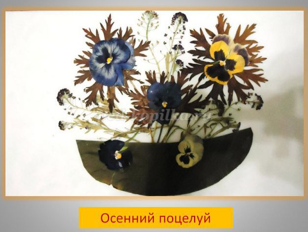 а картинці показано, деякі роботи, зроблені раніше. Готуючись до уроку, я трохи потрудилася і ось такі у мене вийшли роботи: «Хоровод фіалок», «Прощай літо», «Осінній поцілунок». Матеріал для роботи готується влітку і восени, а взимку, коли за вікном мороз 30 градусів, працюючи з квітами, душа наша відтає, зігрівається і хочеться творити, робити добрі справи.
