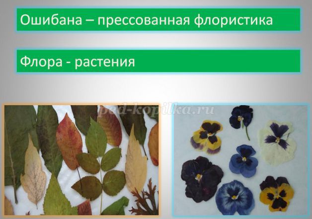 Ошибана - пресованих флористика. Флора - рослини. Значить для своєї творчості я використовую незвичайний матеріал - це квіти, листя, трави, гілки, кора дерев, засушені під пресом так майстерно, що вони зберігають колір та форму.