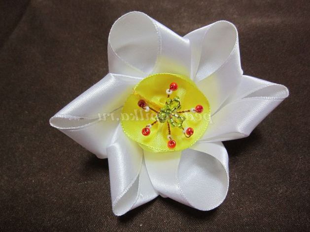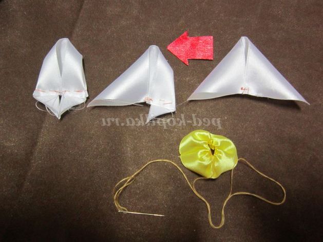 З білої стрічки нарізати 6 деталей для пелюсток і одну деталь для віночка з жовтої стрічки довжиною 12 див.