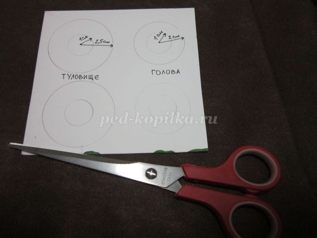 З картону вирізаємо кола діаметром 2 см (2 штуки), 2,5 см (2 штуки). У центрі вирізати отвори діаметром 1 див.
