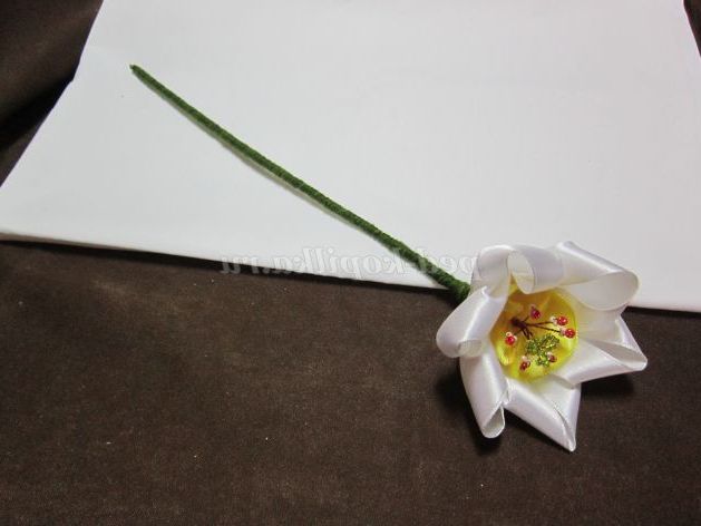 Зібраний квітка виглядає так. Шпажку змащуємо клеєм і прикріплюємо квітка зверху трохи вбік. Обмотуємо зеленою ниткою.