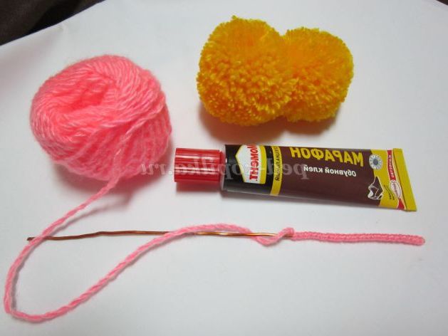 Відрізок мідного дроту діаметром 1,5 мм та довжиною 20 см намазати клеєм і обмотати рожевою ниткою. З рожевої нитки гачком набрати 3 повітряні петлі, скласти їх навпіл і затягнути в малий помпон. Це буде дзьобик.