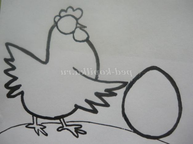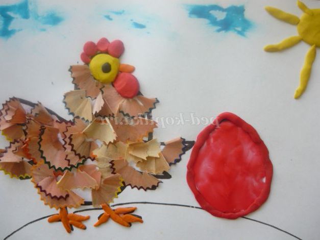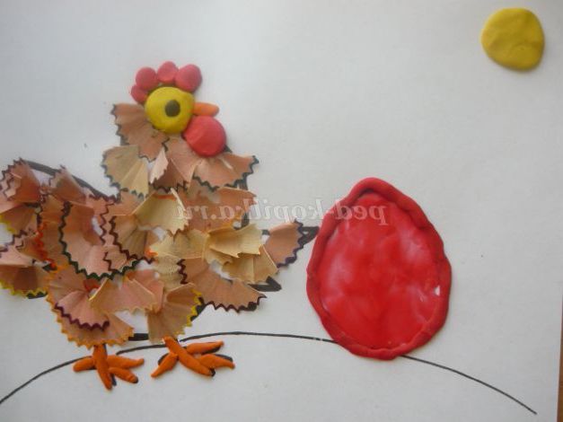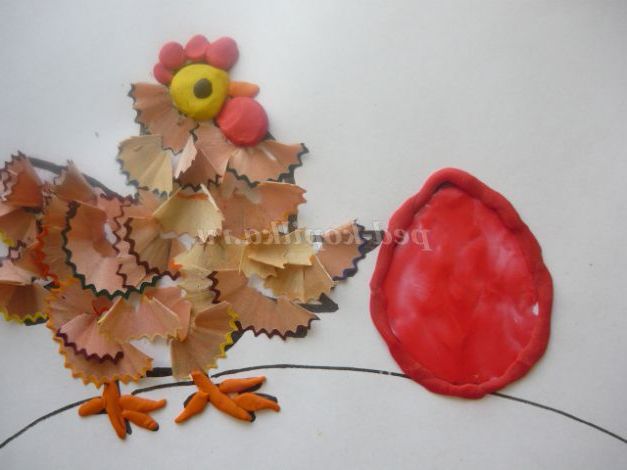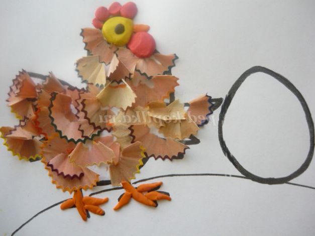У напрямку зверху вниз, накладаємо на намазаний клеєм контур курки, олівцеву стружку.
