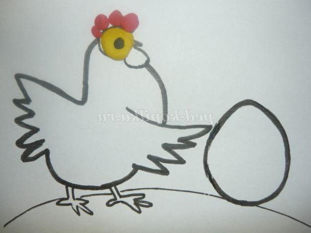 На місце розташування гребінця і борідки накладаємо шматочки пластиліну червоного кольору, скатані в кульки, і теж притискаємо пальчиком на папері.