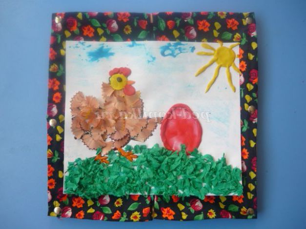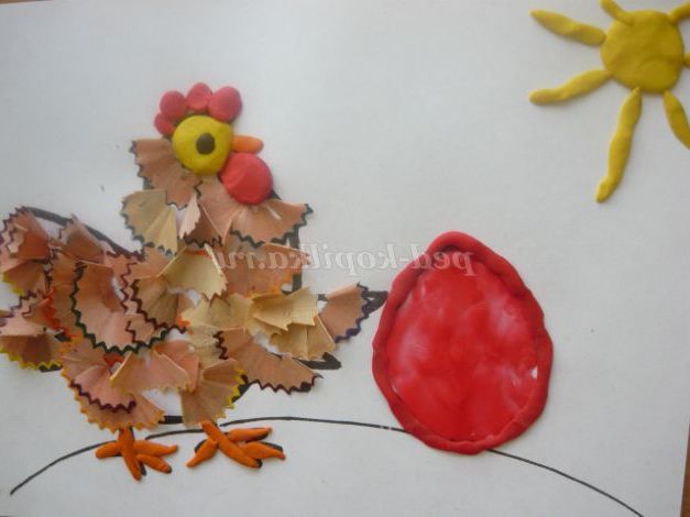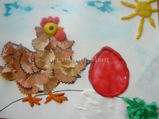 Матеріал: пластилін, клей, пензлик, гофрований папір, стружка від олівців.