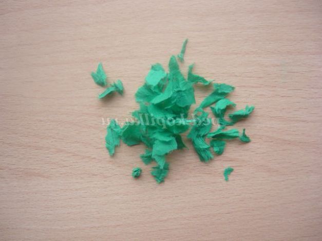 Зелену гофрований папір або серветки рвемо на дрібні шматочки. Це буде травичка.