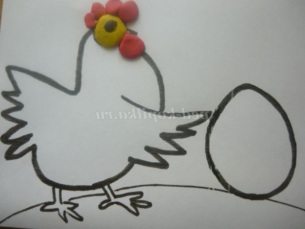 Від шматка жовтого пластиліну відщипуємо не великий шматочок і скачуємо кульку. Накладаємо його на контур голови курки, придавлюючи до поверхні. Вийшла голова.