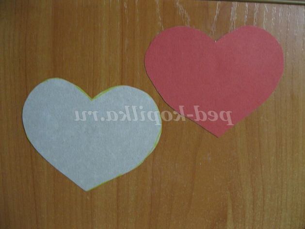 Вирізаємо наші серця з картону. Я взяла червоний картон - односторонній. При приклеюванні сердець, фон практично не видно. Вирізаємо таких 4 штуки
