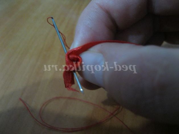 Беремо стрічку (не має значення червона або біла, з якою ви самі хотіли б почати), починаємо робити першу трояндочку. Згинаємо край стрічки вліво.