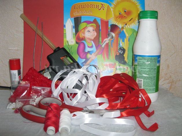 Атласні стрічки двох кольорів (в моєму випадку це біла і червона стрічка довжиною 10м кожна, ширина стрічки 1см.);