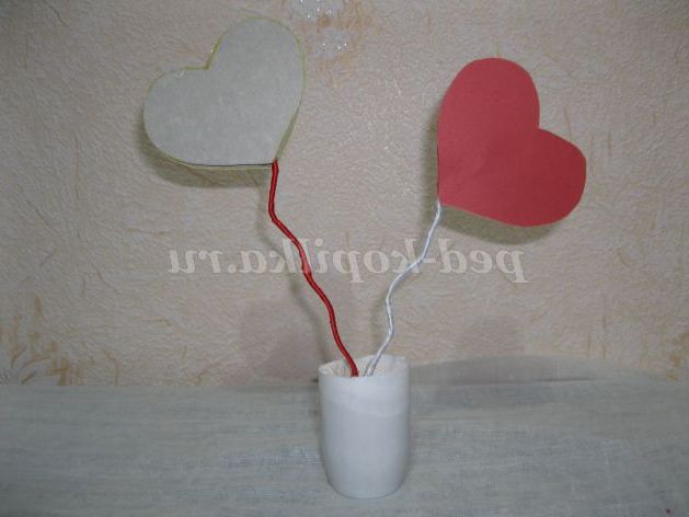 Приклеюємо картонні сердечка на наші гілочки. У нас виходить серце двостороннім - з неї стогони червоний картон, а з іншого білий