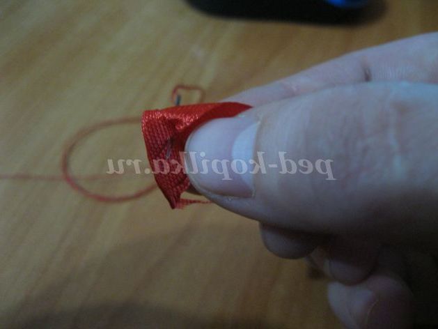 Потім починаємо поступово і акуратно закручувати стрічку по годинникової стрілки формуючи бутон квітки, при цьому закріплюючи ниткою