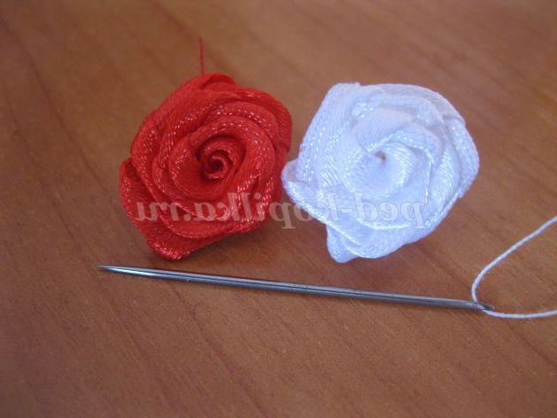 Формуємо трояндочки потрібного нам розміру, край стрічки обрізаємо, ховаємо ззаду квітки за допомогою нитки. Ось такі трояндочки у мене вийшли, їх розмір по відношенню до швейній голці