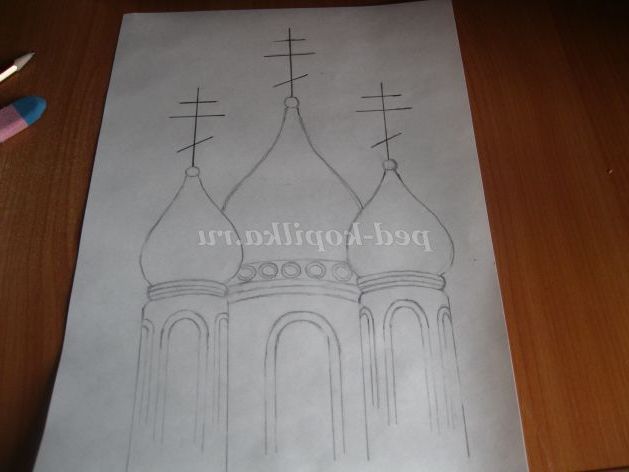 Вирізаний храм, приклеюємо на готовий фон. Золотим шнуром формуємо хрести на кожному куполі храму