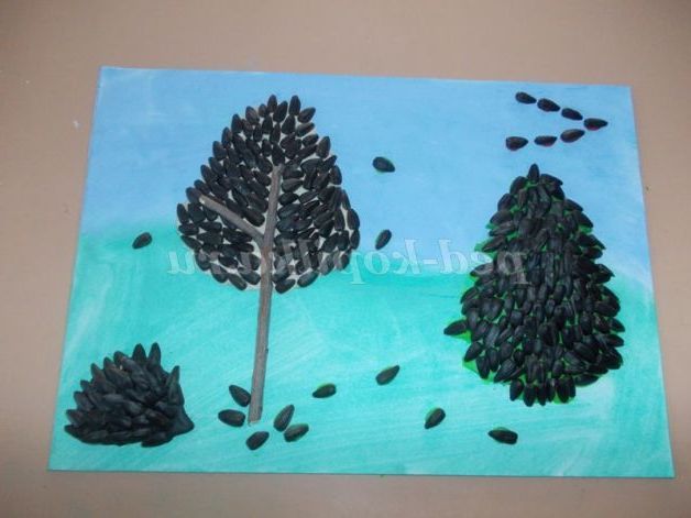 Біля ялинки викладаємо насіння гострим кінчиком вниз у берези гострим кінцем вгору. У берези робимо стовбур.