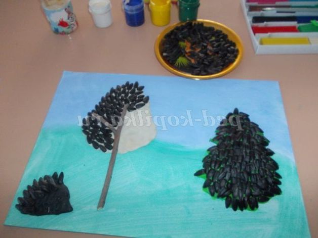 Після того, як затонировали поверхню картинки, потрібно взяти пластилін і виліпити заготовку для берези, ялинки, їжачка і приклеїти на основу для панно.