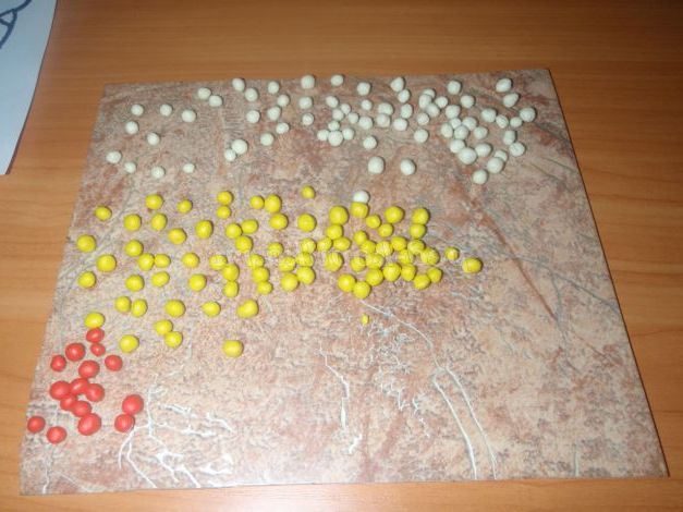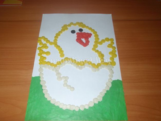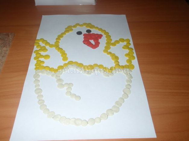 2. Потім беремо аркуш із зображенням курчати і шкаралупи. Викладаємо по контуру кульки, притискаючи їх. Фото 4