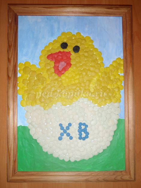 6. Беремо фарбу синього кольору і зафарбовуємо контур неба. Беремо кульки жовтого кольору і заповнюємо контур курчати. З чорного пластиліну робимо очі. Фото 8