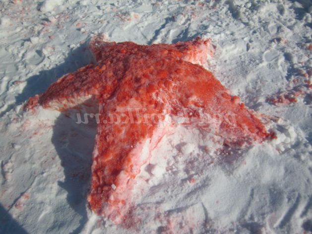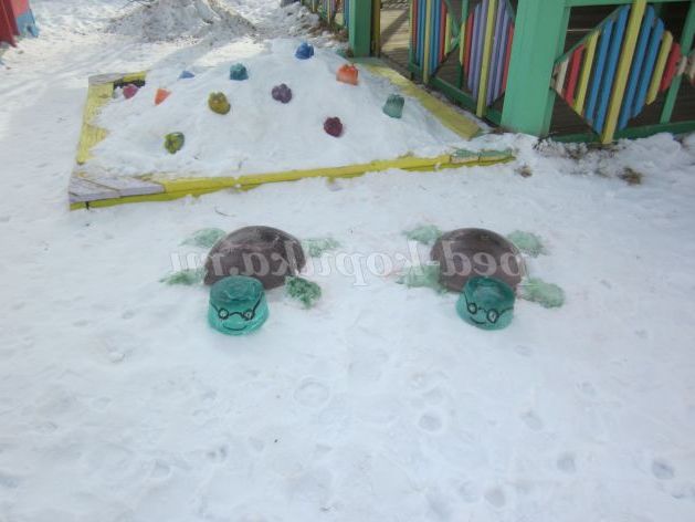 Хоч було дуже мало снігу, і його не абсолютно не вистачало для будівель, ця проблема була вирішена. Для подальшого оформлення ділянки вирішила використовувати кольоровий лід. І ось що получилось.Две веселих черепашки, лід заморожували в маленьких тазиках (для голови і лапок), а для заморозки льоду для панцира використовували зіпсовану кришку від великого прожектора.