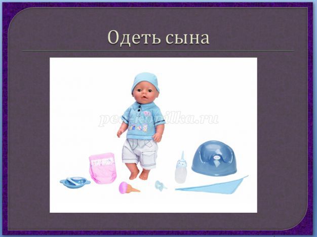 Ведучий: Перший крок - одягаємо сина. Запрошуються по одному учаснику від кожної команди. Ваше завдання - по команді швидко одягнути ляльку. Видається памперси, чепчики, кофтинки та повзунки. Перемагає та команда, яка швидше і правильніше одягне «сина»