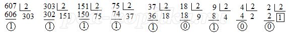Для переведення числа 607 в двійкову систему числення використовується спосіб, описаний у підручниках інформатики. Він полягає в діленні на 2 самого числа з отриманням частки і залишку, потім в розподілі всіх виходять приватних також з отриманням залишків до тих пір, поки останнє приватне не виявиться рівним 1. Цифрами двійкового числа стають остання одиниця, отримана як приватне, і залишки від поділок, виписані у порядку, зворотному їх отримання.