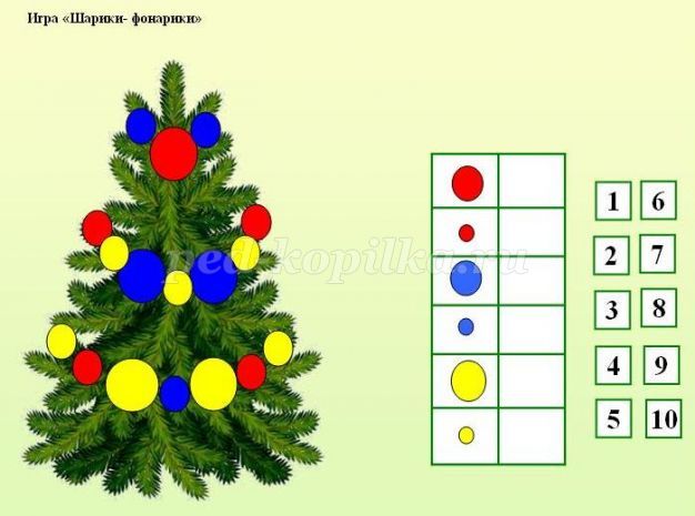 Завдання: Дитині пропонується розглянути картинку і назвати, ніж прикрасили ялинку, назвати форму і колір, потім відібрати цифру, яка показує, скільки на ялинці кульок певного кольору і величини. Дорослий пропонує дитині викласти відповіді цифрами, що позначають кількість (кількість) предметів.