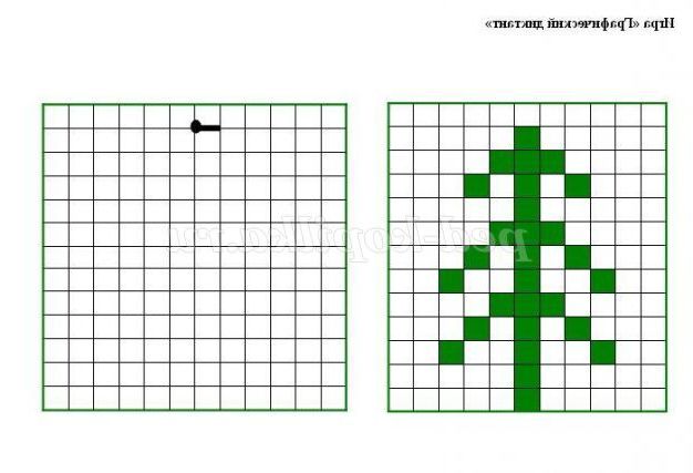 Завдання: Дорослий диктує послідовність дій, дає інструкцію (вказуючи напрям і число клітин) а дитина виконує, малює дотримуючись інструкції на слух. Виконавши завдання, дитина порівнює отримане зображення за зразком.