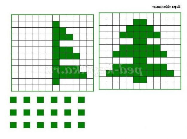 Завдання: Дорослий пропонує дитині розглянути малюнок (геометричне зображення ялинки) і викласти, орієнтуючись на зразок другу половину зображення ялинки геометричними фігурами (квадратами).