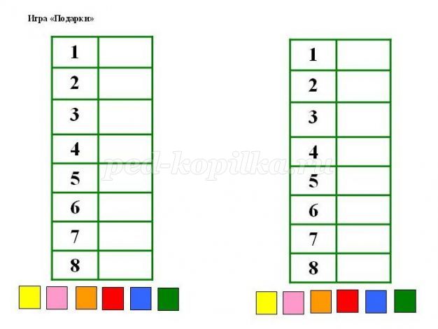 Завдання: Дитині пропонується розглянути картинку і порахувати, скільки подарунків лежить ліворуч і праворуч від ялинки, потім заповнити таблицю - співвіднести подарунки (квадрати) потрібного кольору з цифрами, які позначають їх кількість.