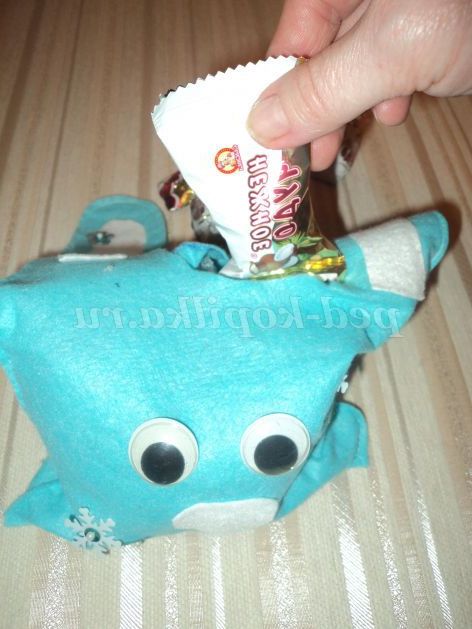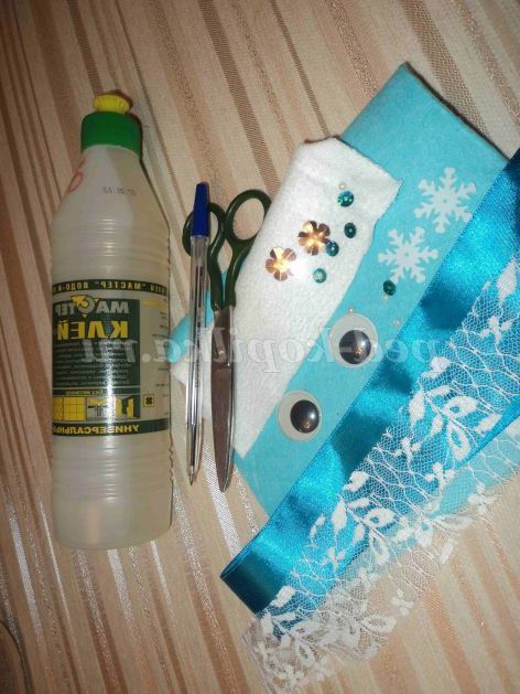 Лист флісу або фетру розміром близько 40 см Х 50 см блакитного кольору (залежно від бажаного розміру), невеликий шматочок фетру білого кольору (для деталей), рухомі очі, ручка, ножиці, голка, нитки, паєтки, красива тасьма близько 30 см, а так само наповнення нашого подарункового мішечка - цукерки або інший сюрприз. Якщо є швейна машинка - можна скористатися нею, якщо немає - можна прошити вручну.