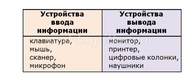 Заповніть таблицю, правильно розподіливши наступні пристрої введення/виведення інформації: монітор, клавіатура, миша, принтер, сканер, цифрові колонки, навушники, мікрофон.