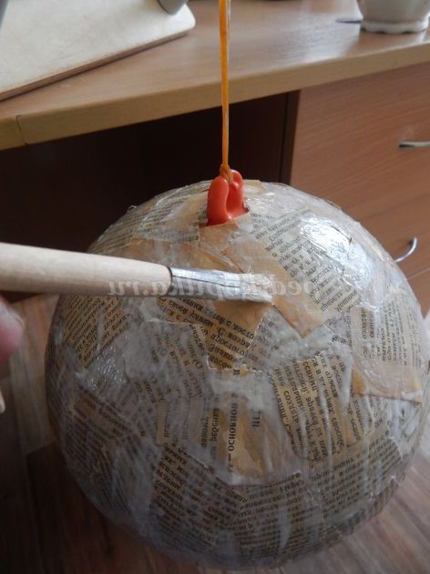 Другий шар я проклеивала папір клеєм ПВА. Куля мені довелося повісити на ніжку перевернутого стільчика,щоб він не стикався з поверхнею столу.